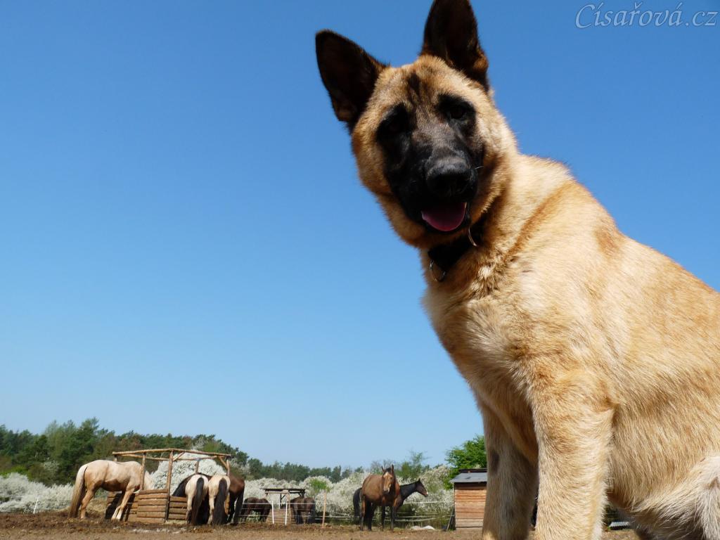 Koně u seníku v zimním výběhu, Samantha dozoruje:-)
