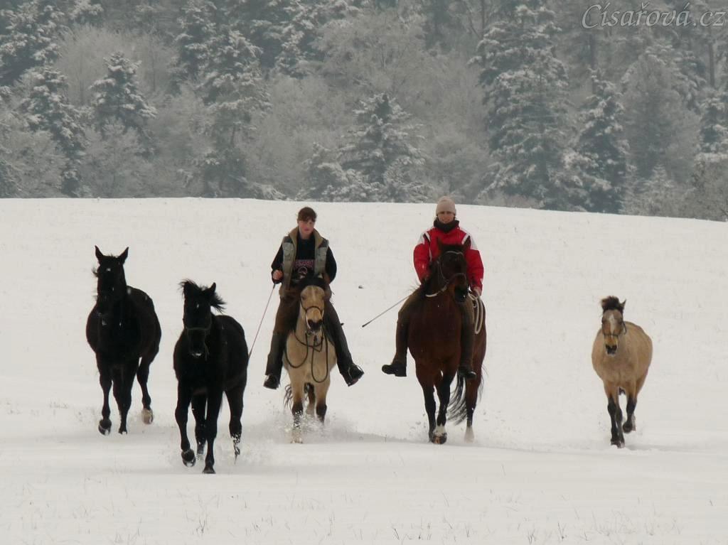 Všichni naši koně pohromadě na vyjížďce, zima 2009
