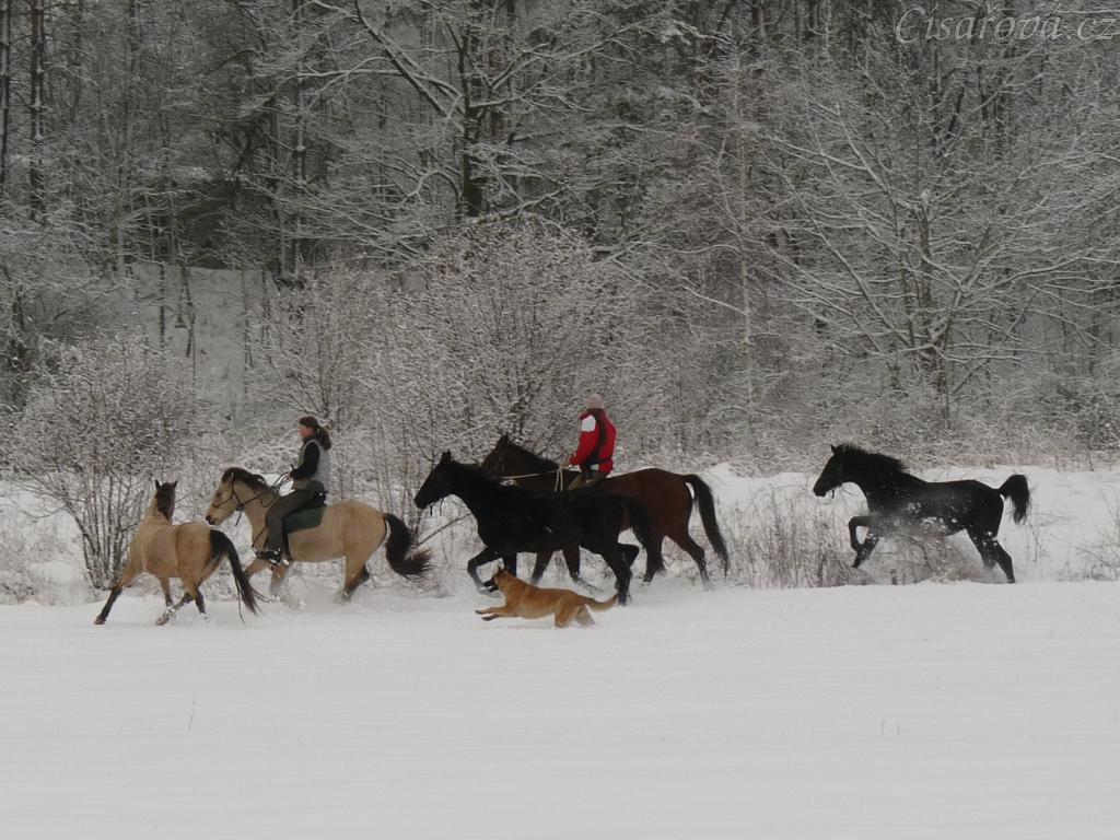 Všichni naši koně pohromadě na vyjížďce, zima 2009