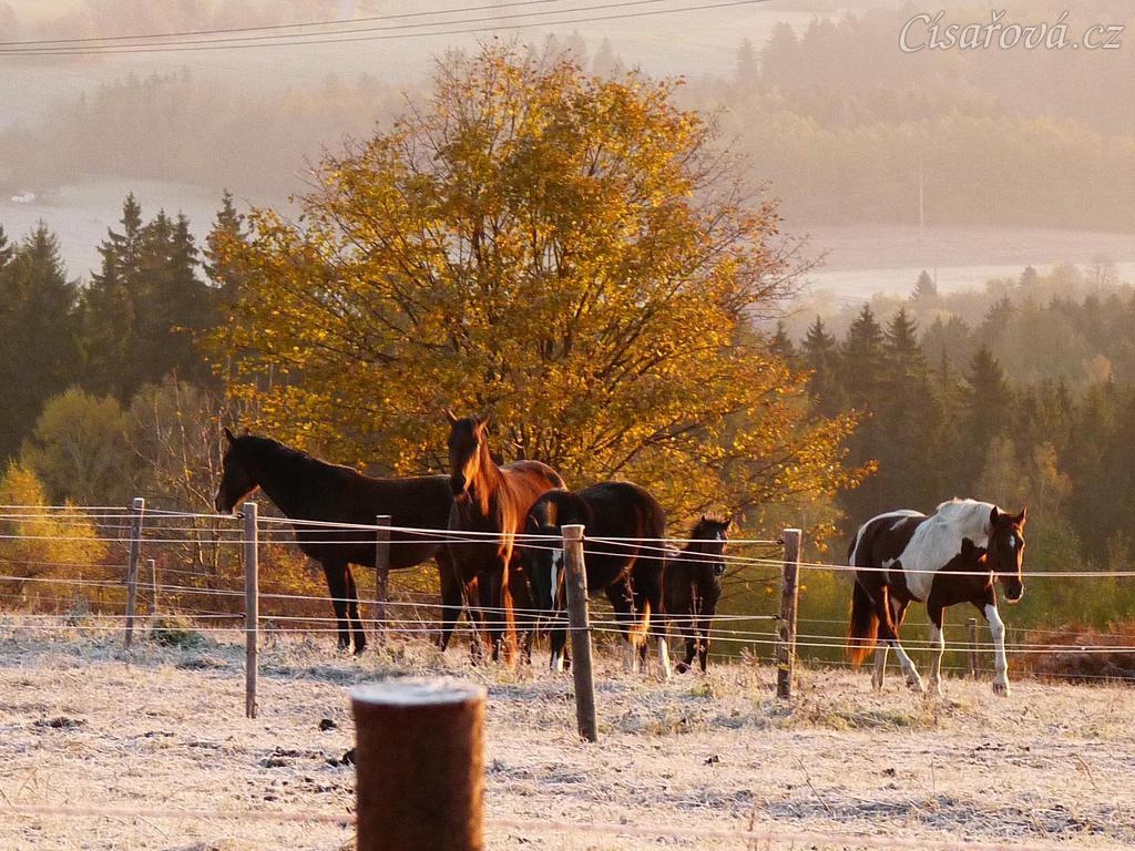 Konec října, východ slunce, ojíněná tráva v zimním výběhu