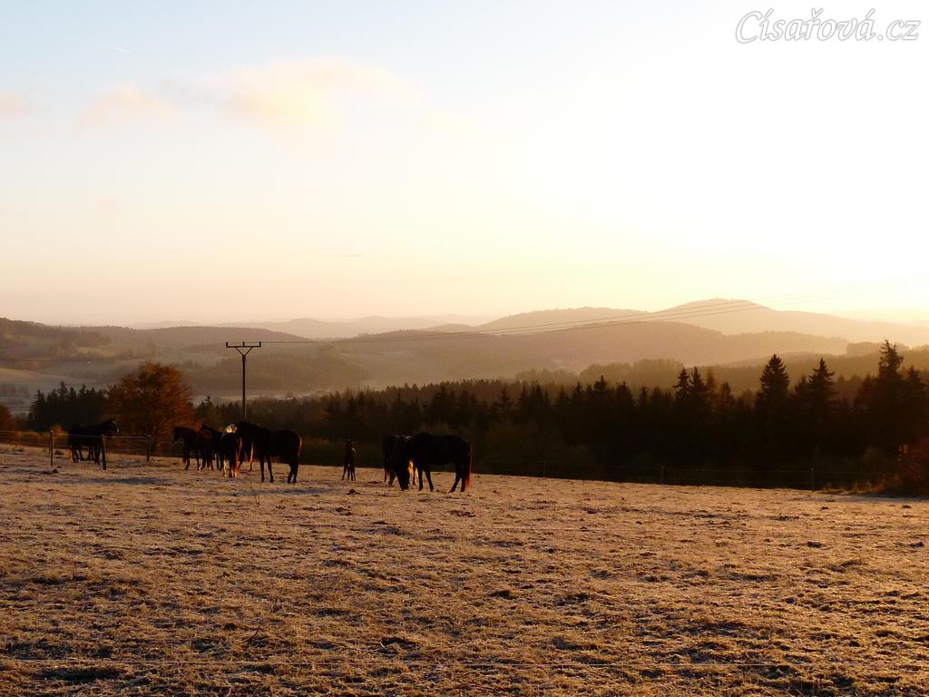 Konec října, východ slunce, ojíněná tráva v zimním výběhu