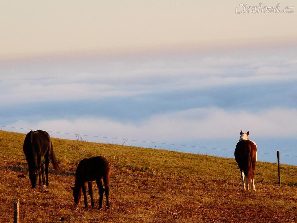 Ranní slunce, koně v zimním výběhu a jejich výhled do krajiny v mlze