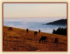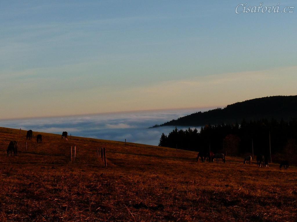Ranní slunce, koně v zimním výběhu a jejich výhled do krajiny v mlze