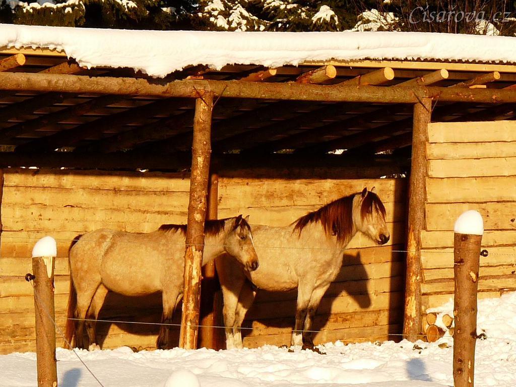 Poníci a jejich oblíbená činnost - odpočinek jedině v přístřešku, za každého počasí:-)
