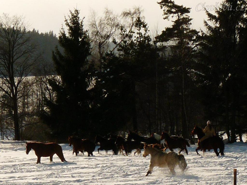 Stádo běhá po výběhu - snaha vyfotit koně v pohybu (jinak celou zimu jen stojí u seníku a cpou se:-)