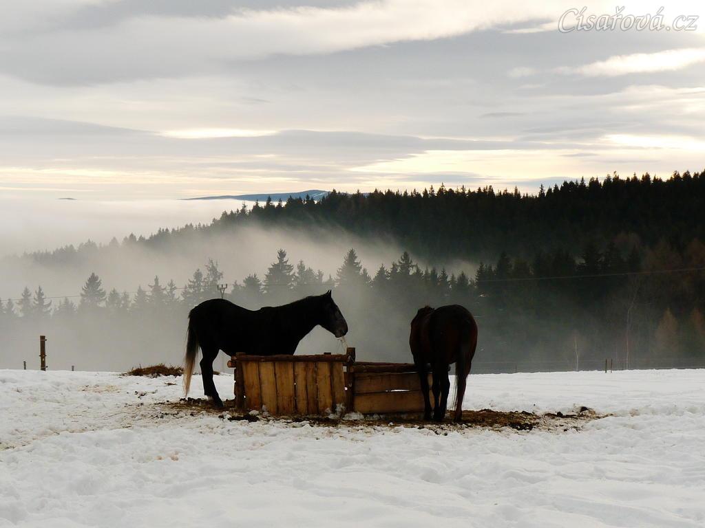 Hřebci u sena, kopce v mlze