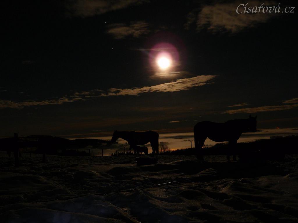 Koně čekají na večeři, svítí měsíc, v údolí je mlha