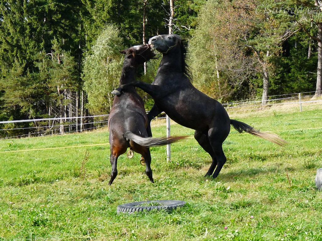 Září 2010, tříletí hřebci Monty a Rybíz si hrají