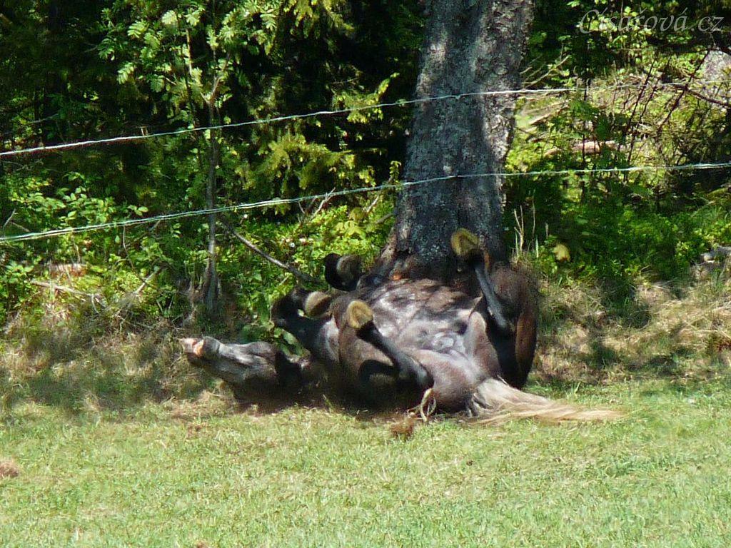 Čtyřletý Rybíz se spokojeně válí pod třešní