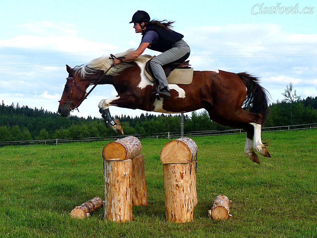 Nový velký oxer (110 x 120 cm) a Vikina při prvním skoku přes něj