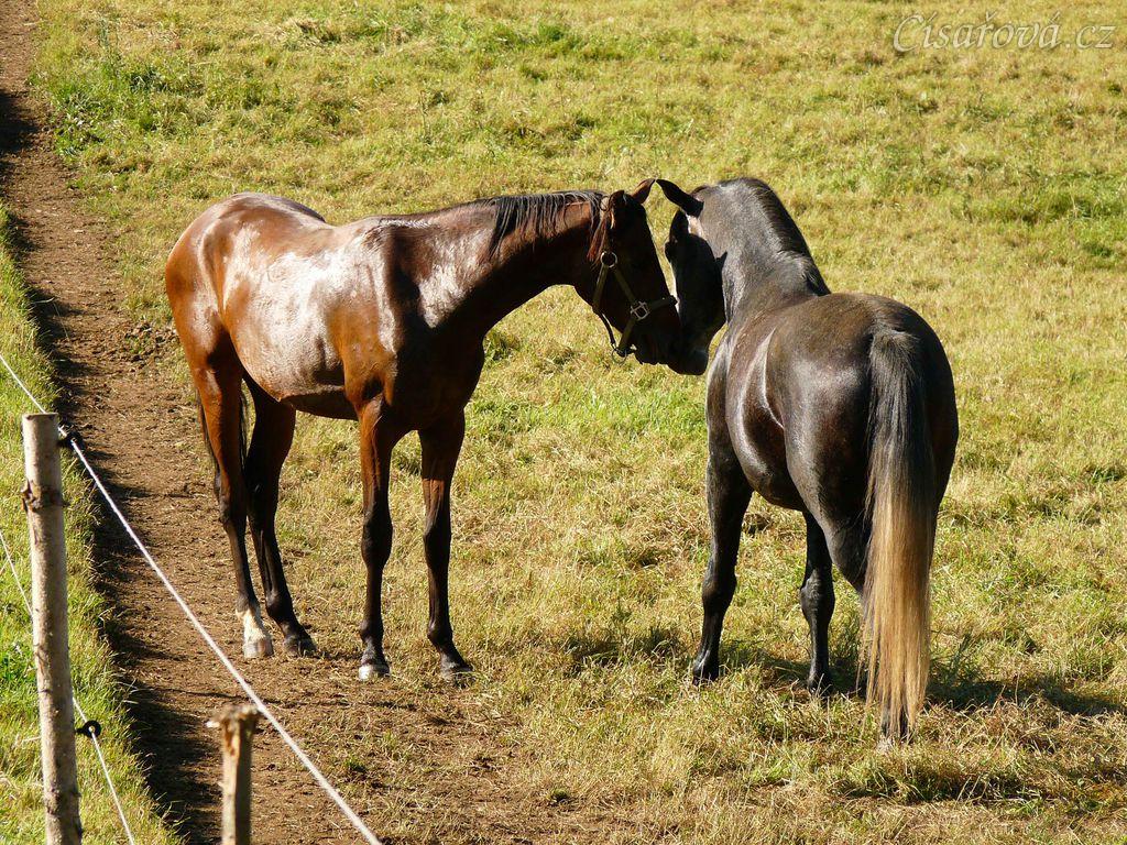 Čtyřletý lipický hřebec Rybíz a roční hanoverský hřebeček Ramon si začínají hrát...