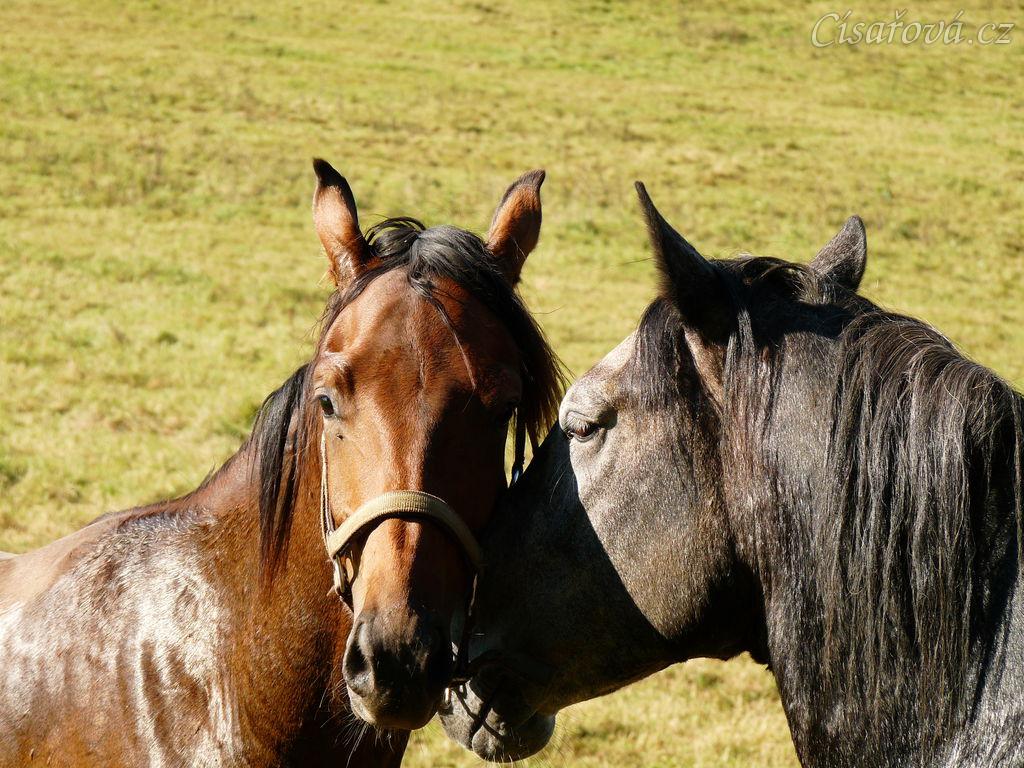 Čtyřletý lipický hřebec Rybíz a roční hanoverský hřebeček Ramon si začínají hrát...
