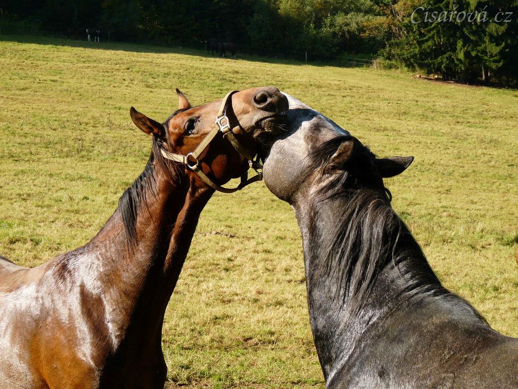 Čtyřletý lipický hřebec Rybíz a roční hanoverský hřebeček Ramon si začínají hrát...