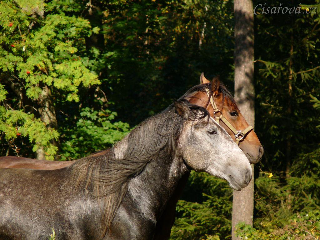 Čtyřletý lipický hřebec Rybíz a roční hanoverský hřebeček Ramon si začínají hrát...