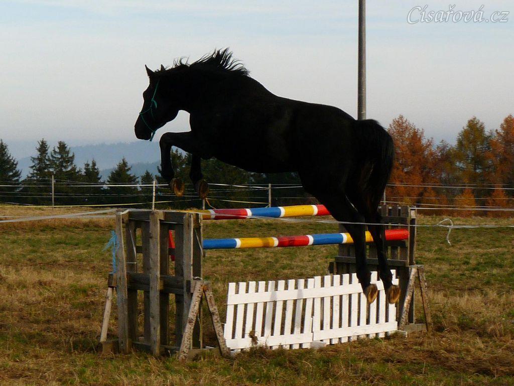 Čtyřletý hřebec Carthago, trakén, s rezervou přeskakuje skok 120cm vysoký