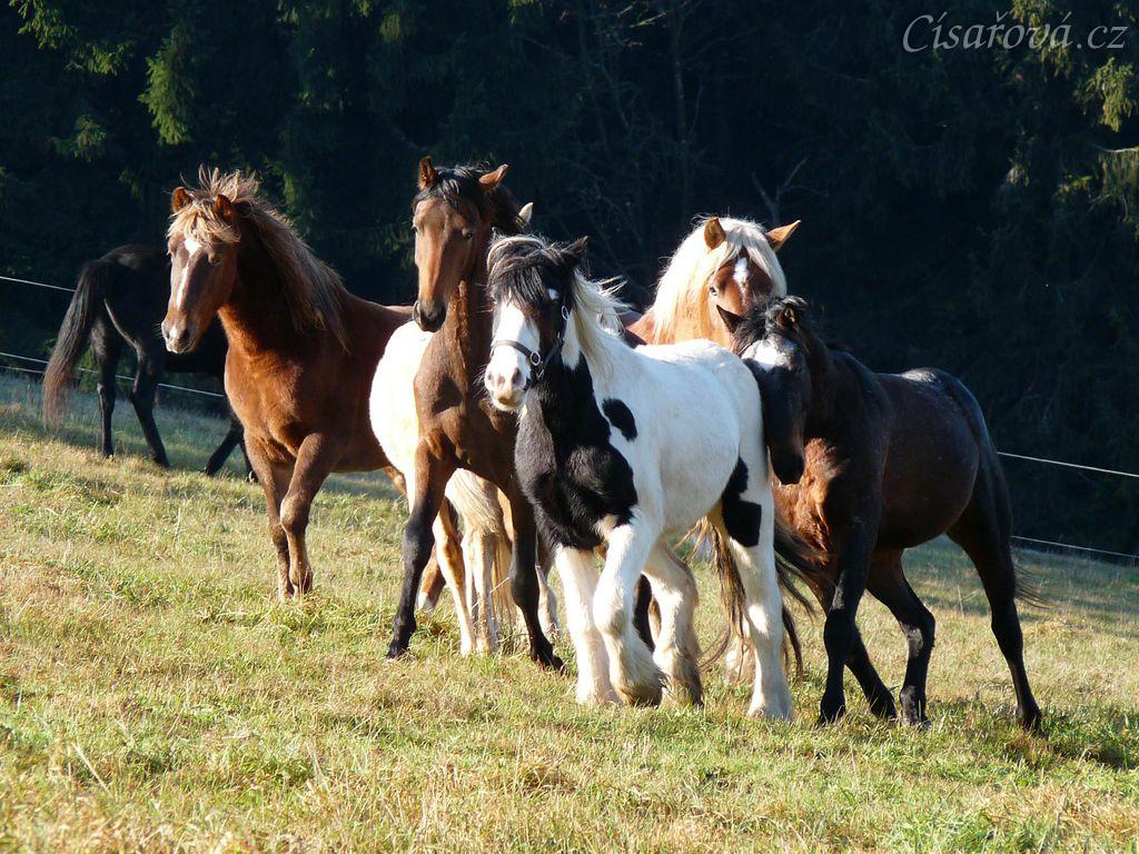 Nový člen stáda, dvouletý Irský Cob, je následován zvědavými hřebci