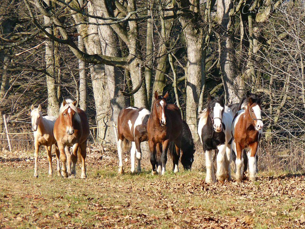 Noví členové stáda, Irští Cobové, za nimi skupinka zvědavých hřebců
