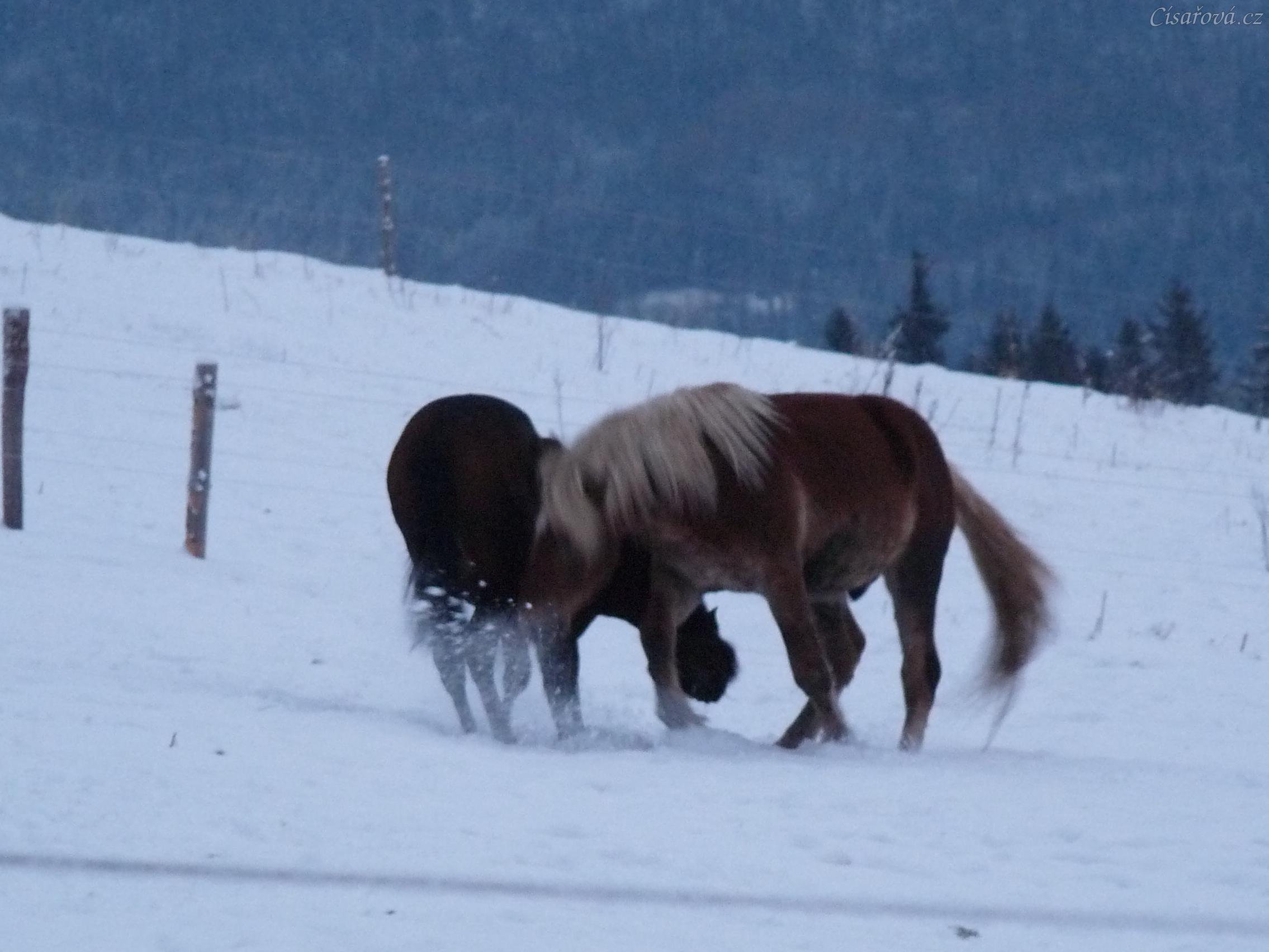 Koně dovádějí při svítání, dvouletý norik Cherokee a roční hannover Ramon. (Kvalita fotek je horší, bylo hodně málo světla, teprve svítalo...)