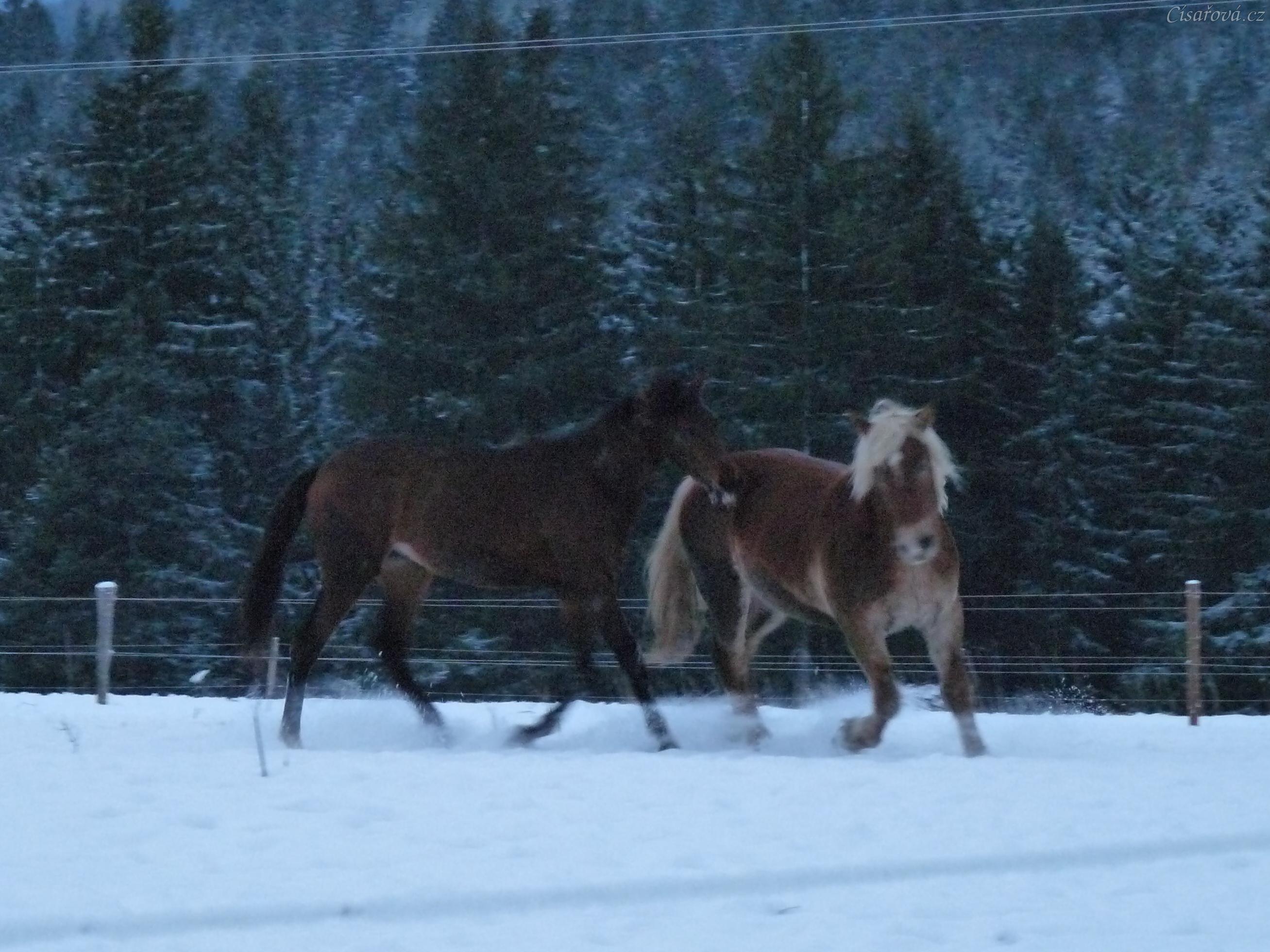 Koně dovádějí při svítání, dvouletý norik Cherokee a roční hannover Ramon. (Kvalita fotek je horší, bylo hodně málo světla, teprve svítalo...)