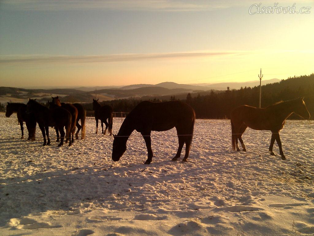 22.12.2011 - Tak už nám konečně začala zima, stádo klisen při východu slunce
