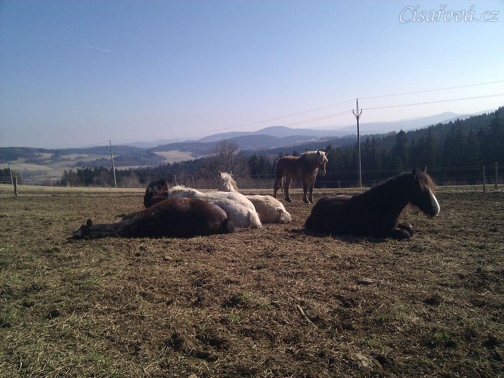 Ranní siesta hřebců, téměř všichni hřebci spí, tradičně "na jedné hromadě" :-)