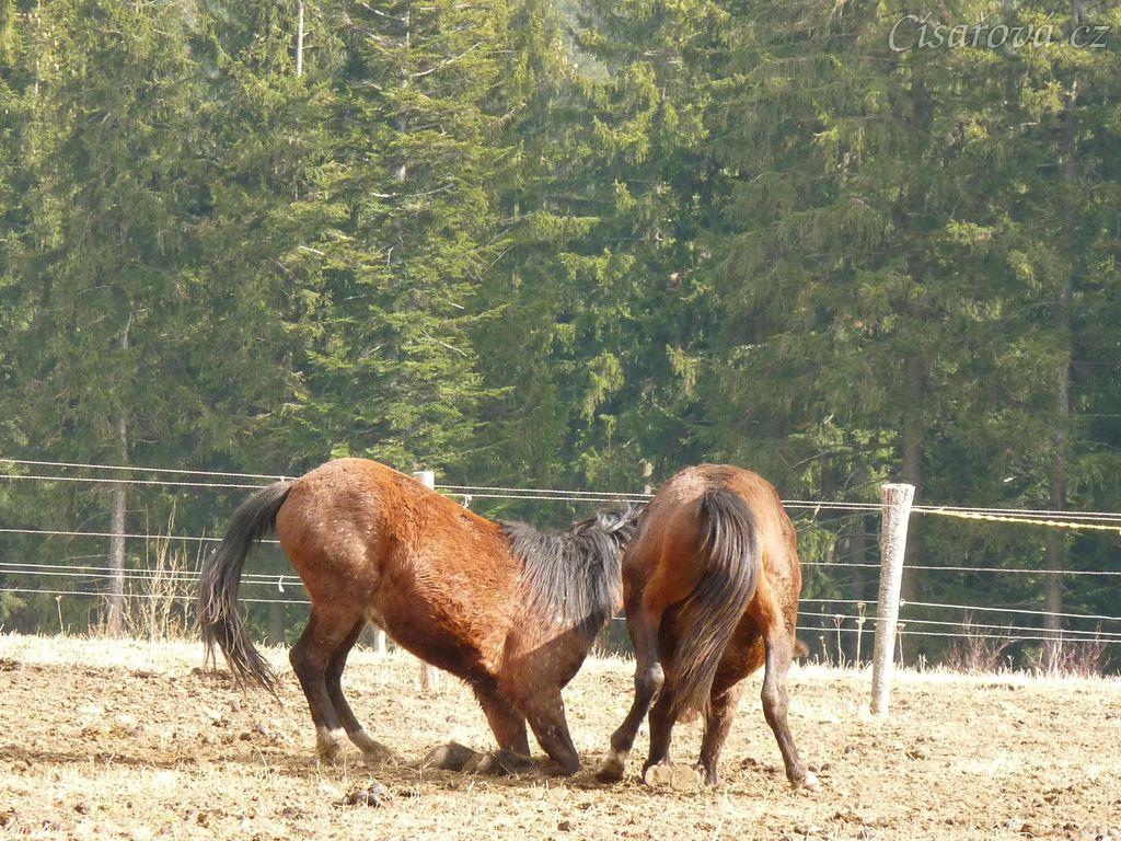 Hřebci dovádí v zimním výběhu