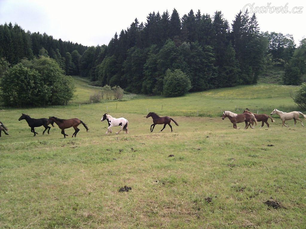 Stádo hřebců dovádí při příchodu nového člena stáda