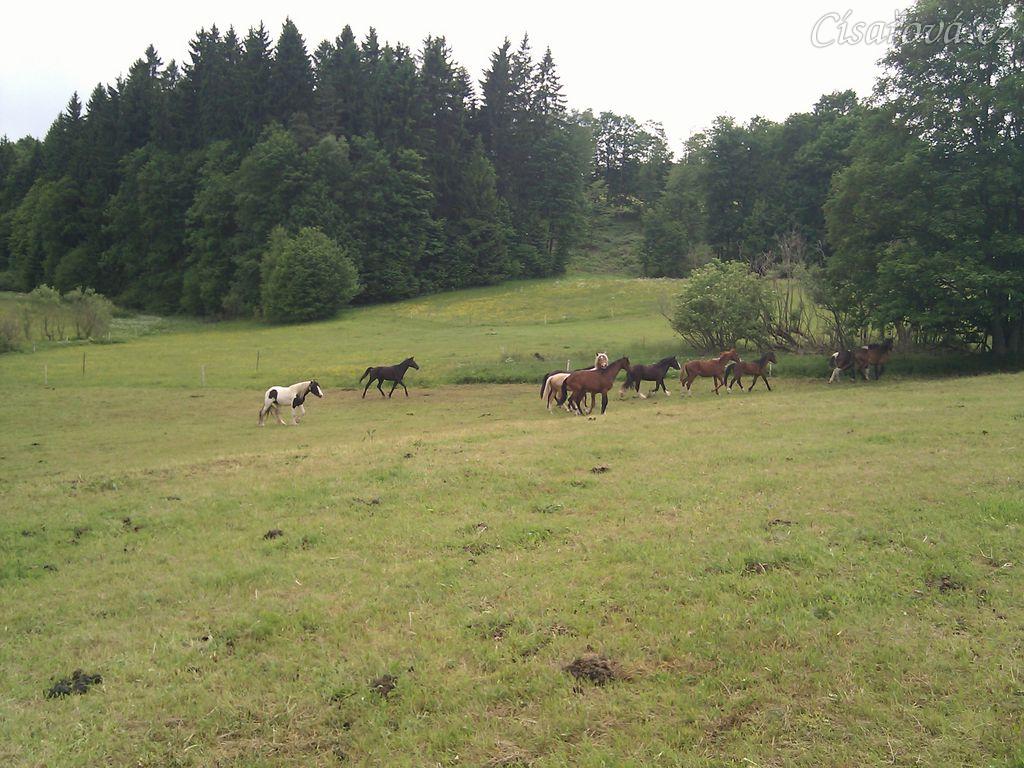 Stádo hřebců dovádí při příchodu nového člena stáda