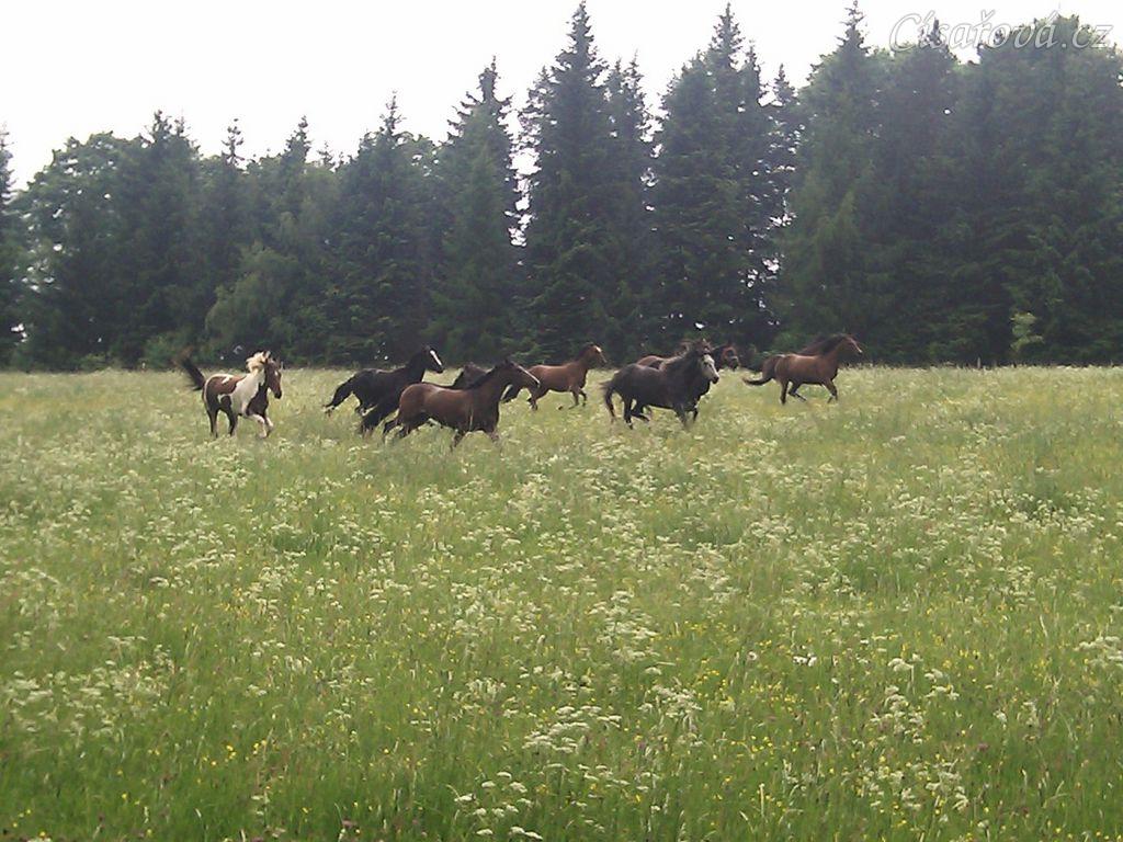 Stádo klisen dovádí při vypuštění na novou pastvinu