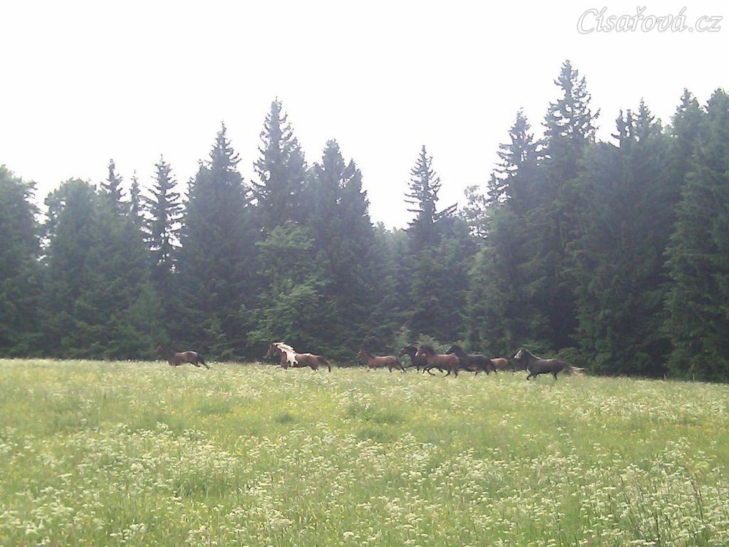 Stádo klisen dovádí při vypuštění na novou pastvinu