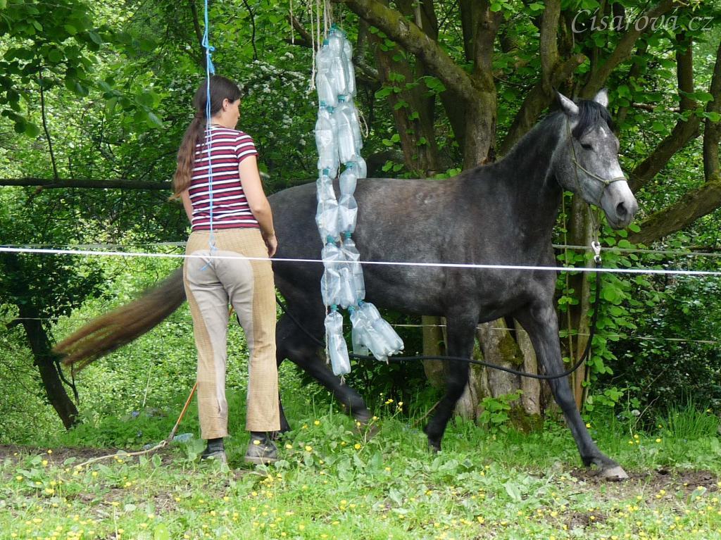 Kasira při práci ze země - prochází mezi zavěšenými pet lahvemi