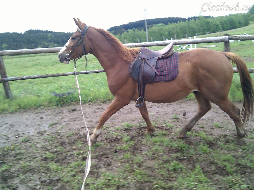 Tříletý CS valach poprvé na lonži se sedlem a uzdečkou