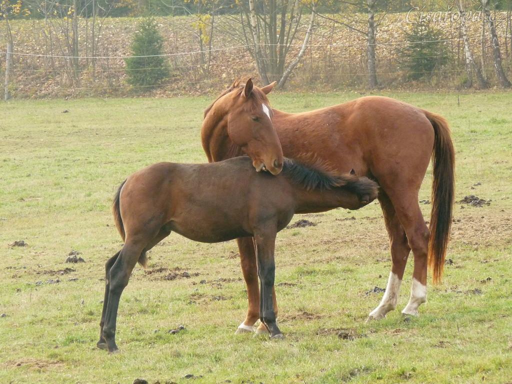 Nově příchozí letošní hřebeček hledá mléko u tříletého hřebce :-)