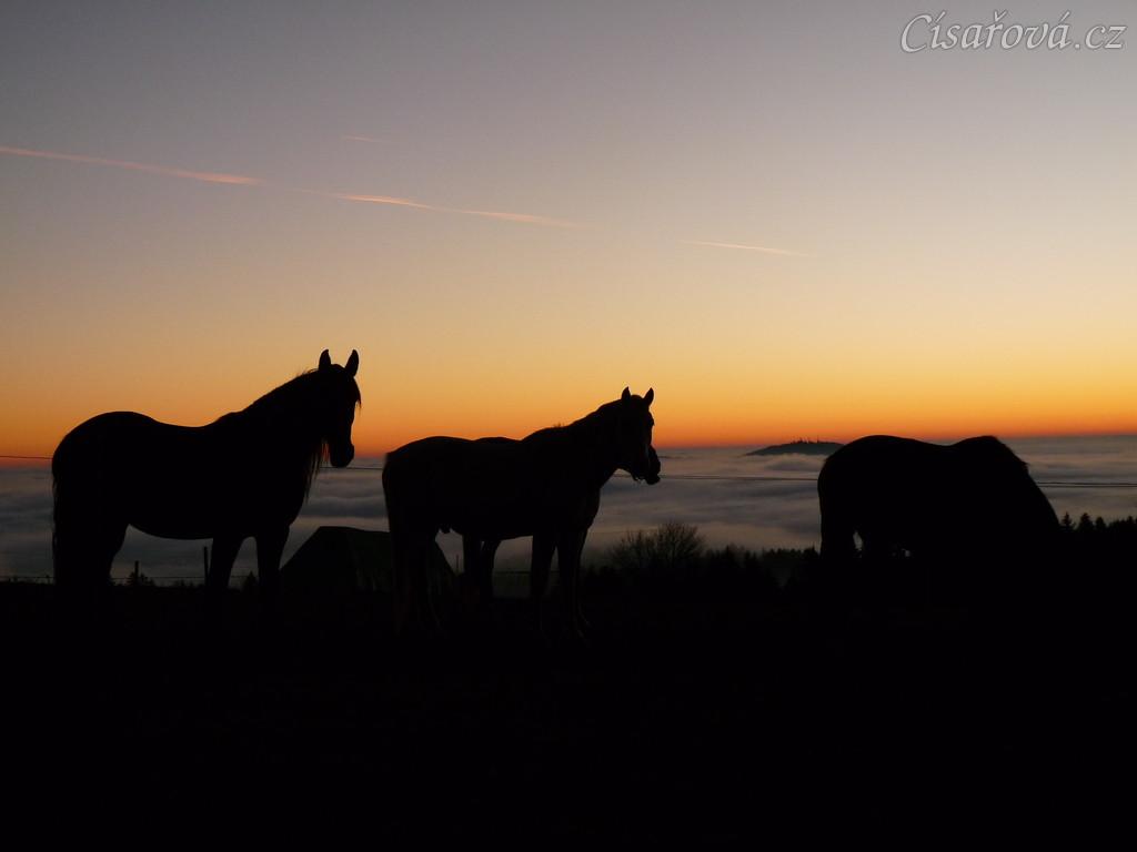 Mlhavá podzimní rána, stádo klisen