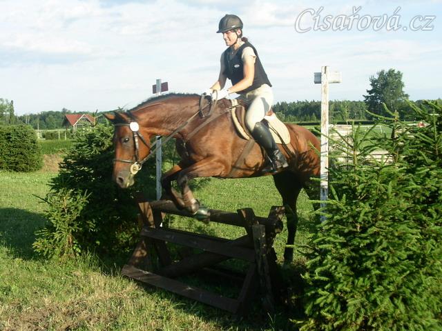 Trénink terénních skoků, skok přes kozu u jámy, kůň i jezdec se plně soustředí na jámu za skokem