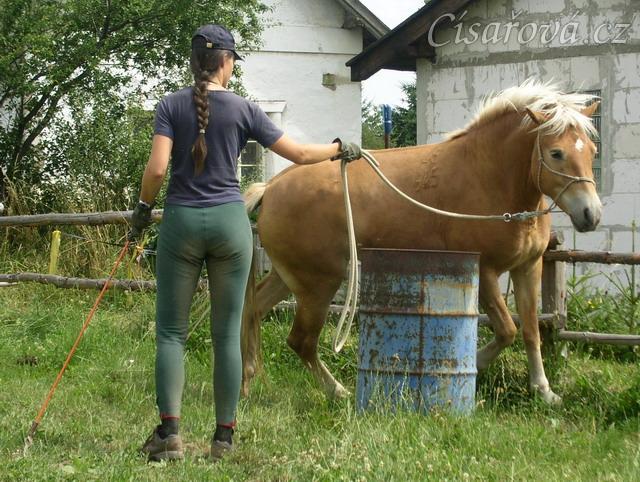 Bela při práci ze země: stlačovací hra, procházení mezi sudem a ohradou.