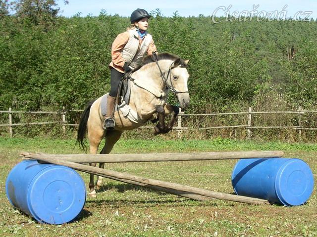 Tereza a Greisy: skoky přes větší překážky také nejsou problém, jen se jezdkyně jednou rukou ještě drží sedla.