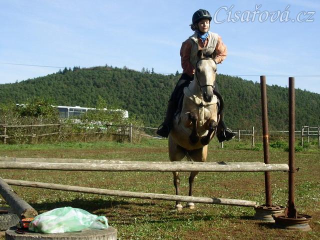 Tereza a Greisy: skoky přes větší překážky také nejsou problém, jen se jezdkyně jednou rukou ještě drží sedla.