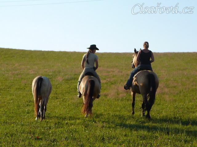 Keisy na vyjížďce se svou majitelkou, jdeme krokem do kopce
