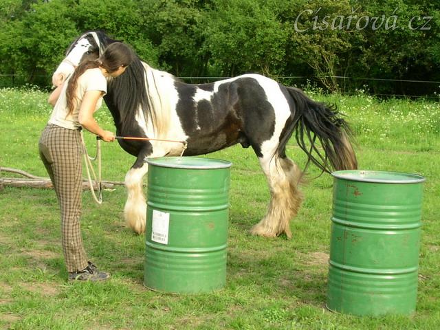 7 her podle Pata Parelli - otočení a pozvání koně zpět po průchodu mezi sudy